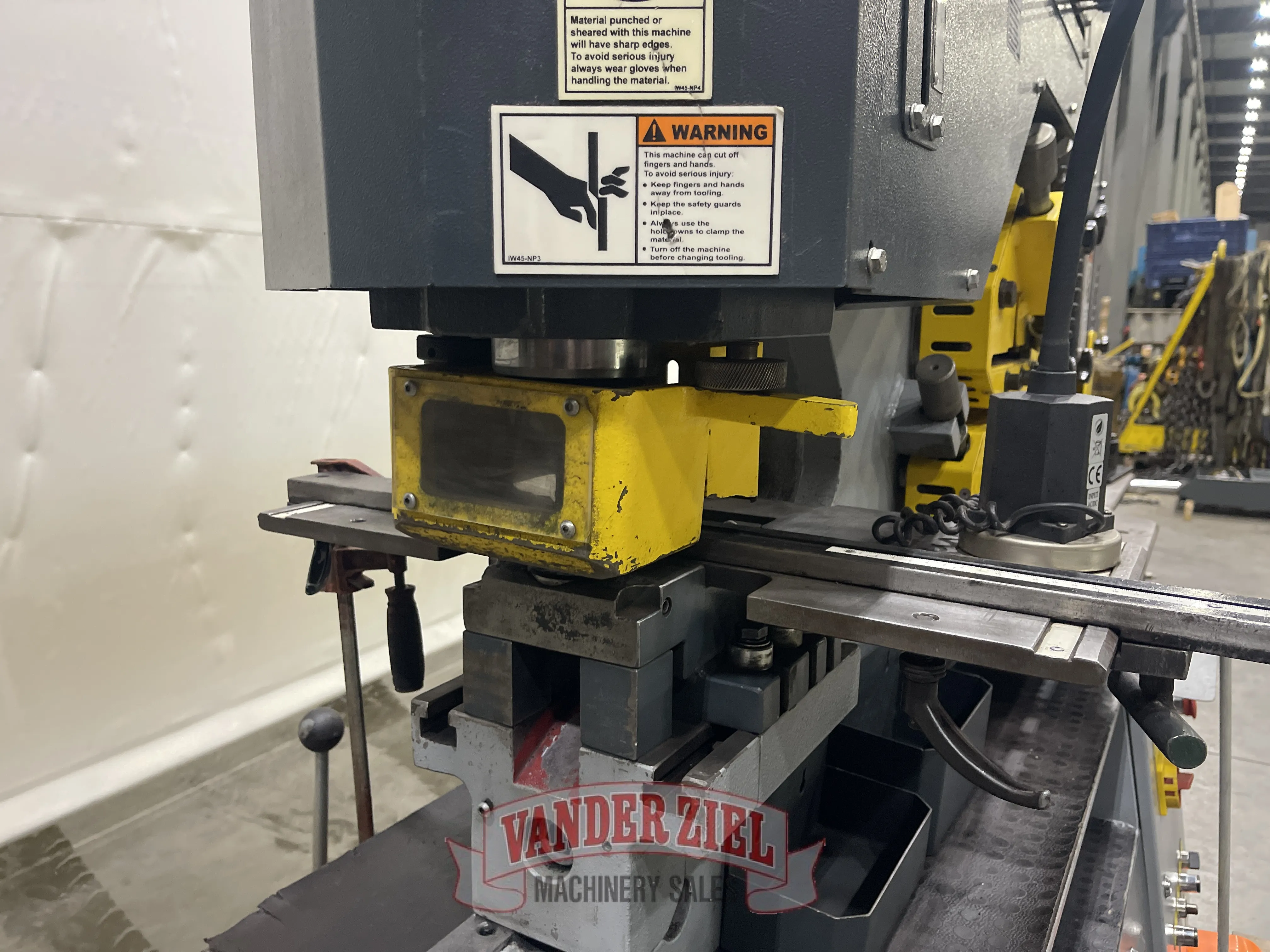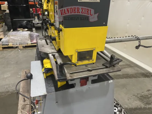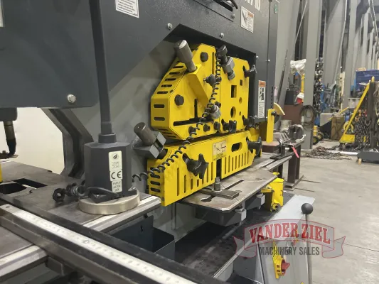 PUNCHINGPunch Pressure: 71 tons.Punch Holder and Jog ModePunch Work Table: Includes back gauge and adjustable stops.Adjustable See-Through Punch Stripper: For fast and easy setup.Die Holder: Adjustable in machined T-slots for quick punch and die alignment.Standard Tooling: 1-1/2” in 9/16”.CPD Series: 26 punch, 62 die.Large Tooling: 2” in 7/16″CPD Series: SP51P punch, SP80D die.Optional Oversize Tooling: 4-5/16” in 3/16” material.Throat Depth: 12”Stroke Length: 2-5/32”.Cycles per Minute in 3/4”: 25.Punching Station Work Height: 40-9/16”FLAT BAR SHEARINGFlat Bar Shear Capacity: 14” in 5/8”.Maximum Width x Thickness: 12” in 3/4”.Lower Blade: Four (4) usable edges.Support Table: Includes guides for accurate positioning and indicator lines at 30 and 45 degrees left and right.Adjustable Hold-Down: Holds work piece securely in position when shearing.Upper Shear Blade: Provides for minimum distortion. Two (2) usable edges.Blade Length: 15”.Angle Flange Trim: 4”.Flat Bar Shear Work Height: 35-1/2”ANGLE SHEARINGMaximum Capacity – 90 degrees: 5” x 5” x 1/2”.Maximum Capacity – 45 degrees: 2-1/2” x 2-1/2” x 3/8”.Shearing with no material loss and minimum deformity.Shear Blades: Four (4) usable edges.Angle Shear Work Height: 44-7/8”. | BAR SHEARINGRound Bar Max. Capacity: 1-3/4”.Square Bar Max. Capacity: 1-3/4” x 1-3/4”.Six Cavity Round and Square Bar Shear Sizes: Round: , 1/2”, 1”, 1-3/4”Square: 3/4”, 1-3/4”Channel Shear Max. (optional): 5”.I-Beam Shear Max. (optional): 5”.Bar Shear Work Height: 44-7/8”NOTCHINGRectangular Notcher: 1-3/4” x 3-9/16” x 3/8”.Electrical Interlock Safety GuardGauge Table with Stops: For precise positioning.Notcher Work Height: 35-1/2”.OTHER STANDARD EQUIPMENTFive (5) Sets of Punches and Dies:Punches: 9/16”, 11/16”, 13/16”, 15/16”, 1-1/16”Dies: 19/32”, 23/32”, 27/32”, 31/32”, 1-3/32”CPD Series: 26 punch, 62 die.Magnetic Base Work LightAdjustable Electric Back Gauge (36”)24 Volt DC Control VoltageScrap Boxes at Punching and Notching StationsAdjustable Stroke Depth at PunchTwo (2) Full-Control Foot PedalsTwo (2) Hole Die HoldersTwo (2) Piece Gauging Table at Punch StationKeyed Punch Holder for Shaped ToolingStandard Voltage 230/460 Volt, 3 Phase, 60HzSingle Phase Machines: Not Available.Machine Net Weight: 3520 lbsMachine Dimensions: 70” L x 39” W x 74” H3’ Electric Back Gauge |